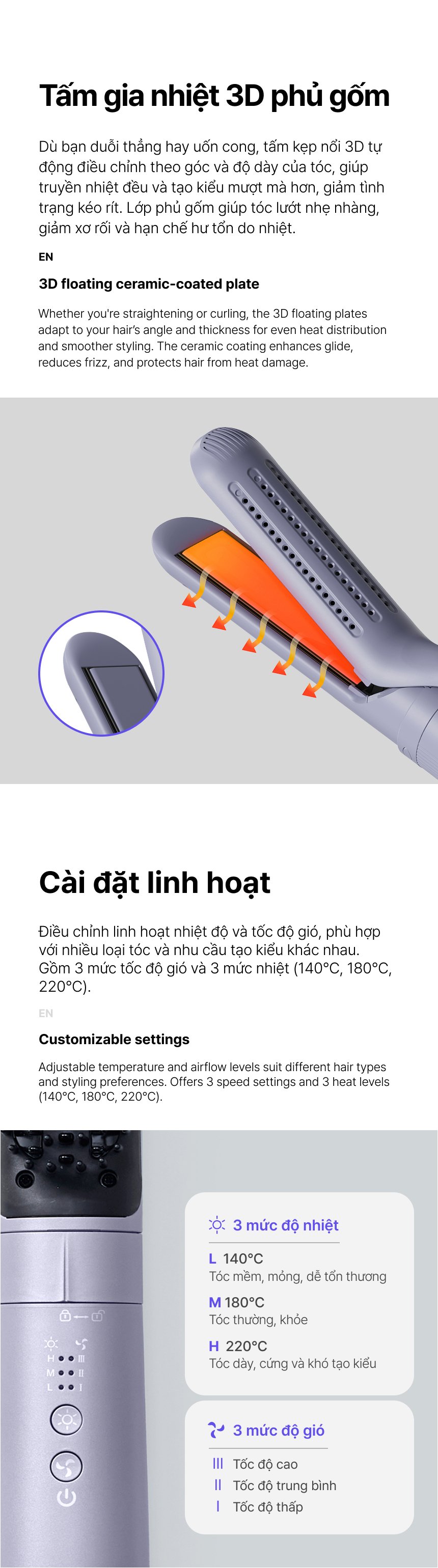 3D ceramic-coated heating plates: Adjust automatically to hair thickness and angle, ensuring smooth styling with less friction.
