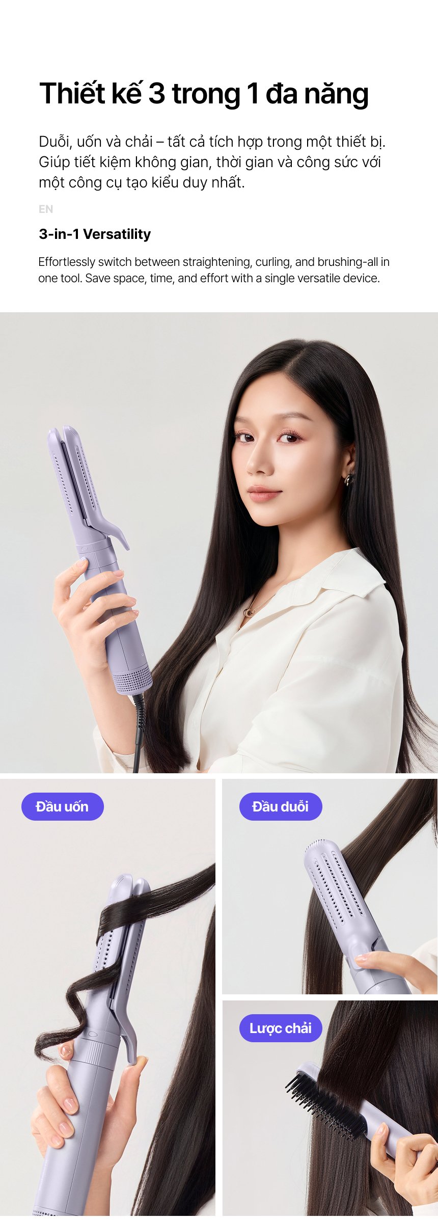 3-in-1 versatile design: Straightening, curling, and brushing in one device – saves space and time.