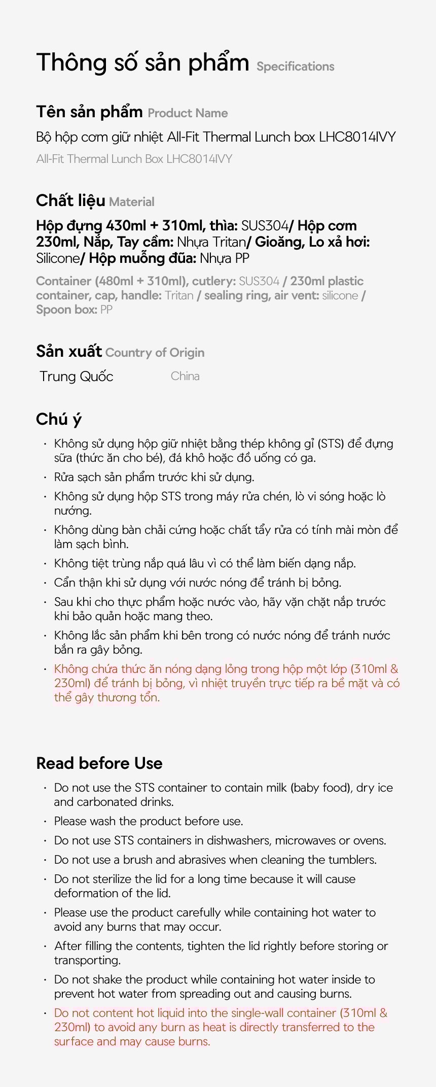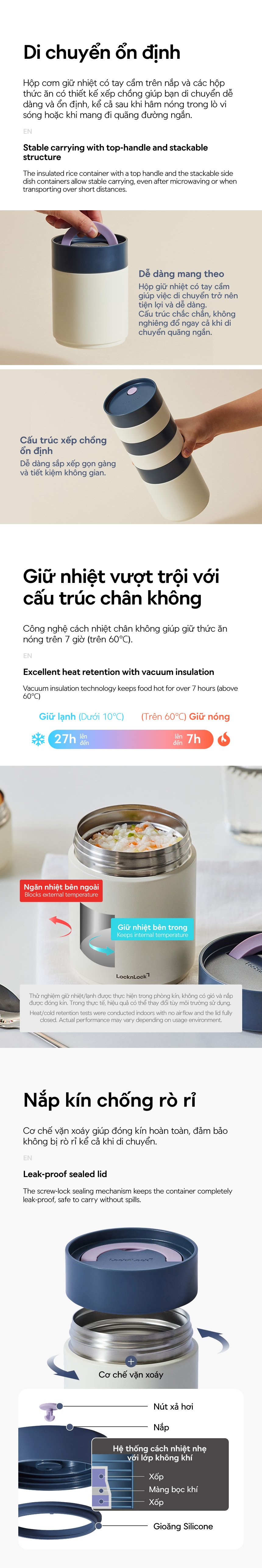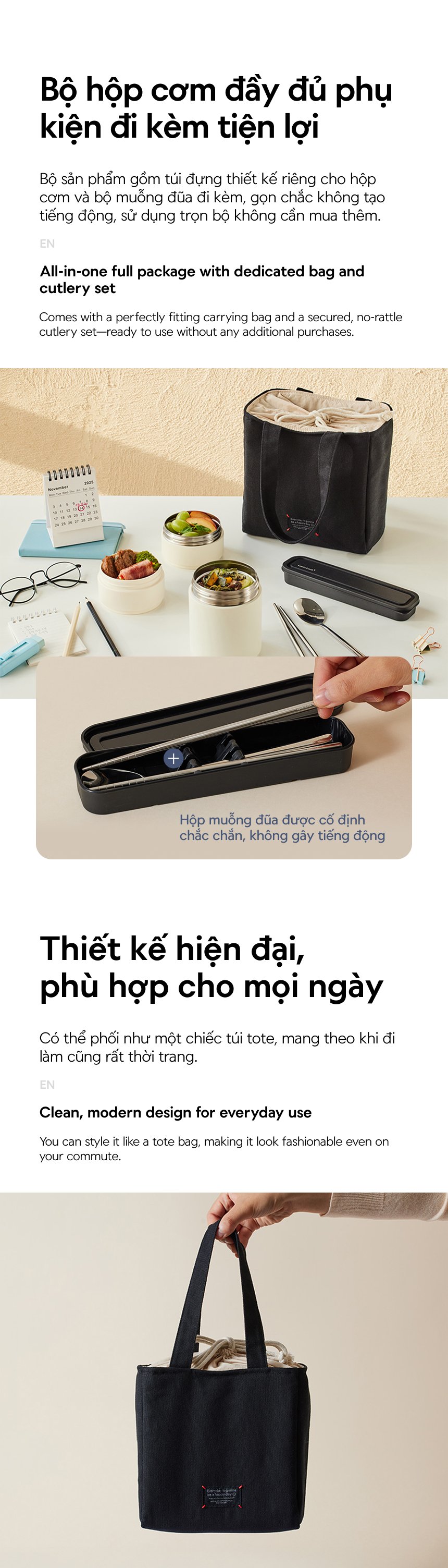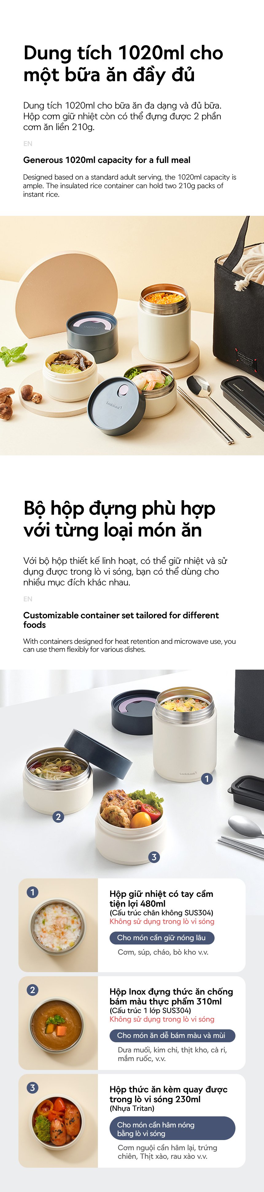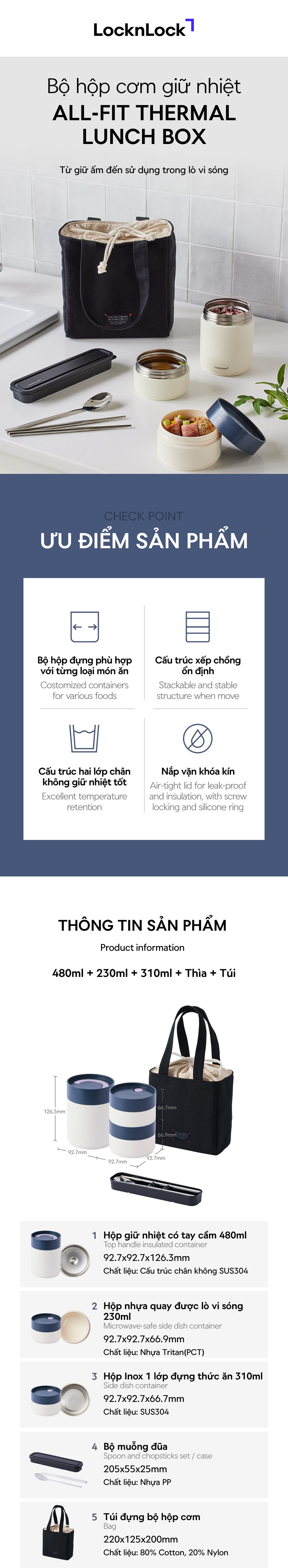 Bộ hộp cơm giữ nhiệt LocknLock All-Fit Lunch Box (230ml*1, 310ml*1, 480ml*1, bộ đũa và thìa, túi) - LHC8014IVY