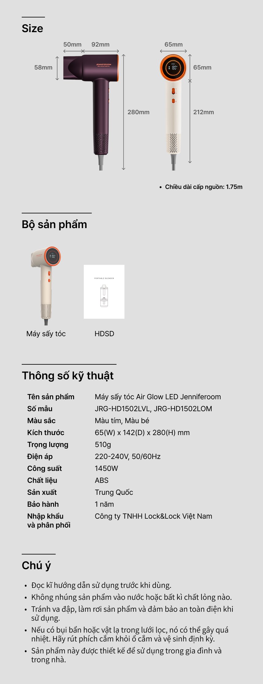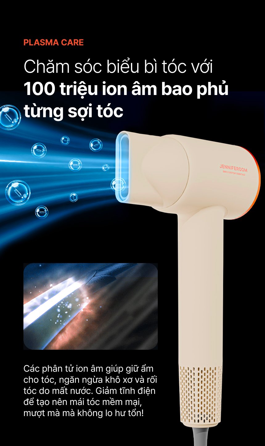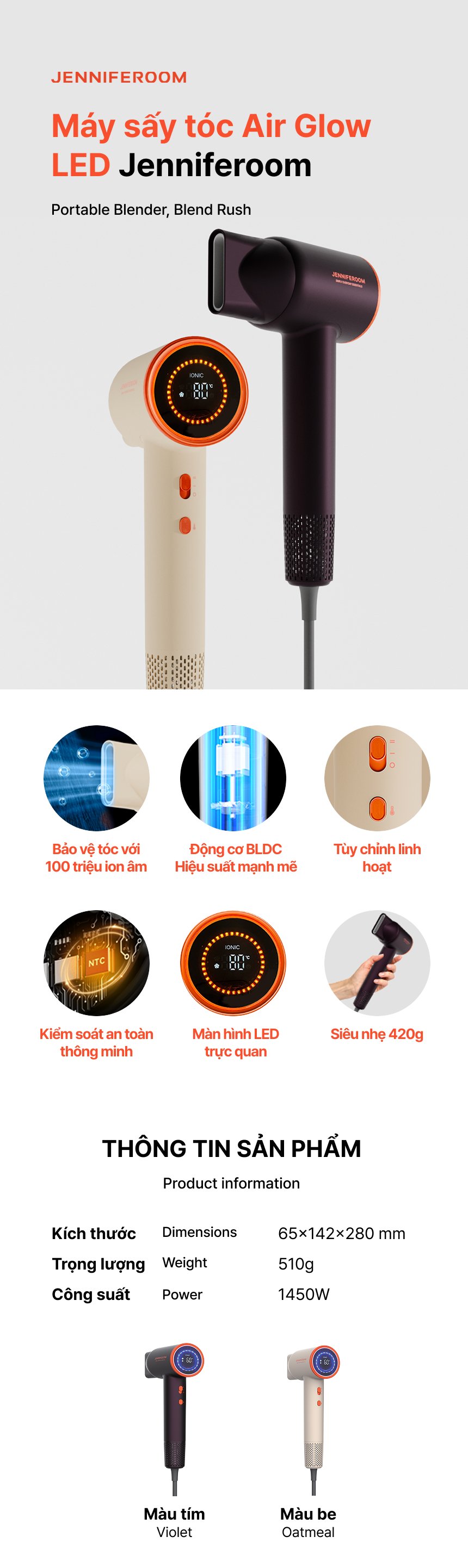 Máy sấy tóc Jenniferoom công suất 1450W, động cơ BLDC, công nghệ ion âm - 2 Màu - JRG-HD1502